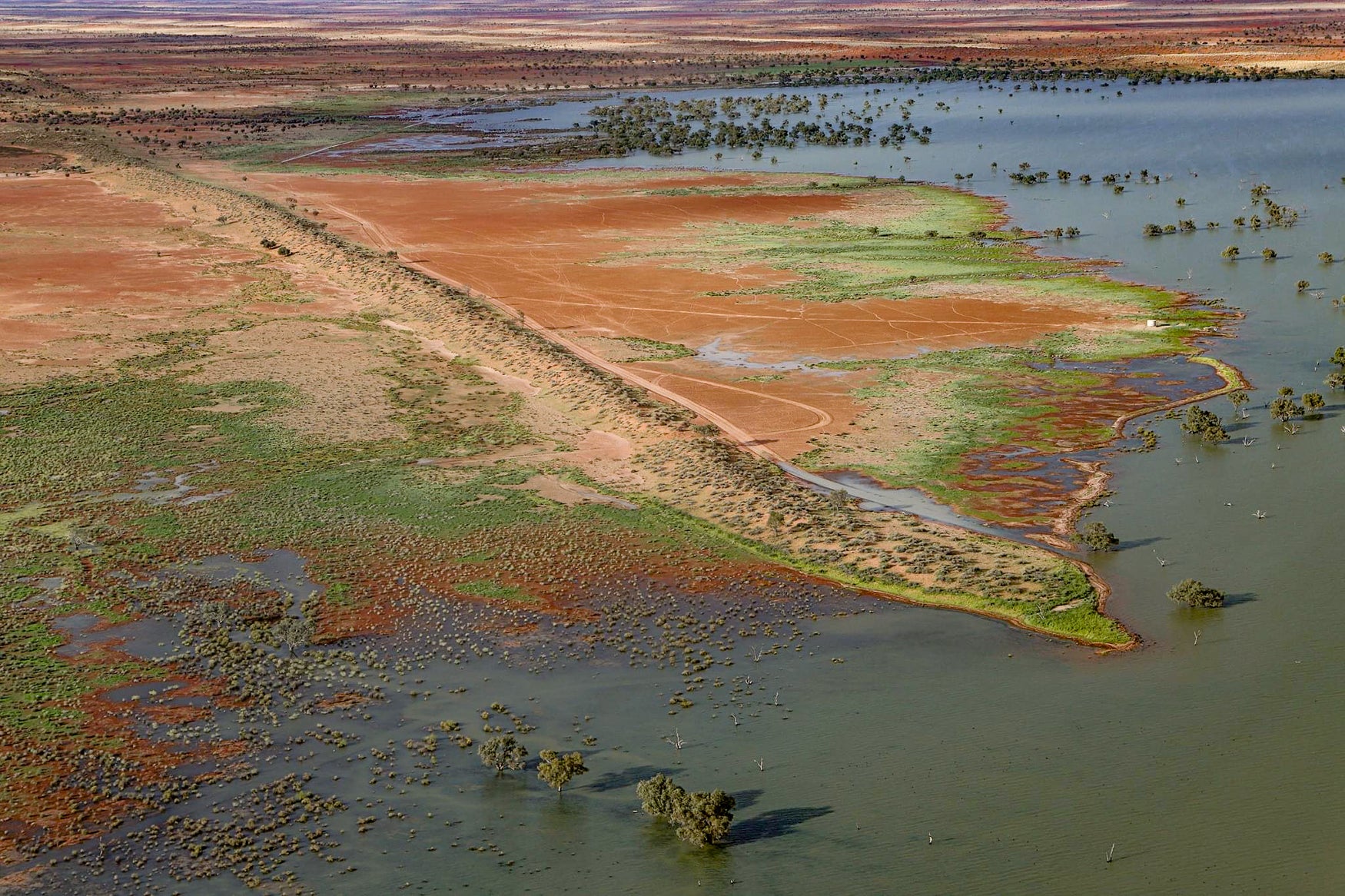 The floodwaters travelling through Adria Downs Station (located on the edge of the Simpson Desert) paint a lush tableau against the arid landscape. From above, the floodwaters tell a story of renewal and rejuvenation - a natural phenomenon that brings life to the land and sustenance to its inhabitants.