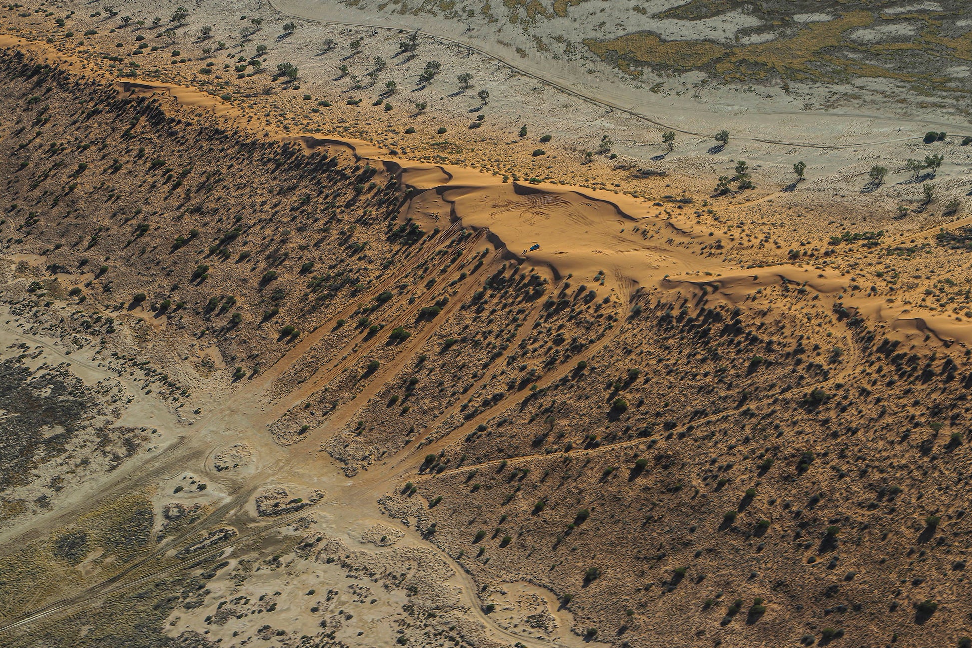 A timeless testament to nature's grandeur. From above, the colossal sand dune stands as a majestic sentinel. Ribbons of shadows caress the undulating slopes, revealing the intricate textures sculpted by the wind's gentle embrace. As the sun's golden rays dance upon the desert canvas, Big Red emerges as an iconic silhouette, casting a spell of awe and wonder upon all who behold its splendour from above.