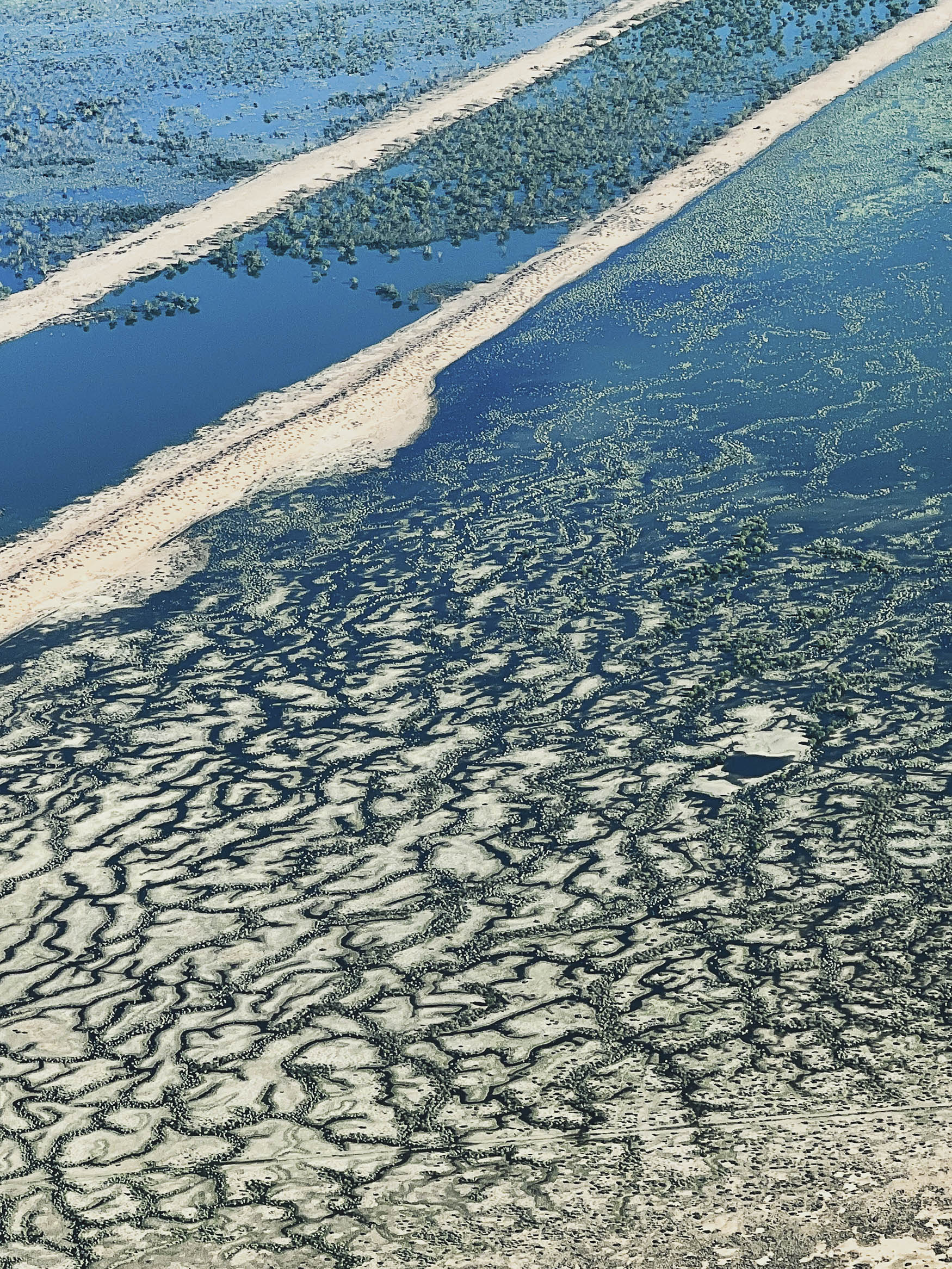 In the heart of the channel country lies Lake Muncoonie, together with the Mulligan River and Eyre Creek, it borders the sand dunes of the Simpson Desert. From above, the patterns of the water form a mesmerizing mosaic, a testament to the harmonious interplay between land and river, where nature’s brush strokes create beauty beyond compare. From elegant wading birds to graceful waterfowl, the area serves as a haven for migratory birdlife. A shimmering jewel amidst the vastness of the outback, where the rhythms of nature unfold in a breathtaking symphony of life.