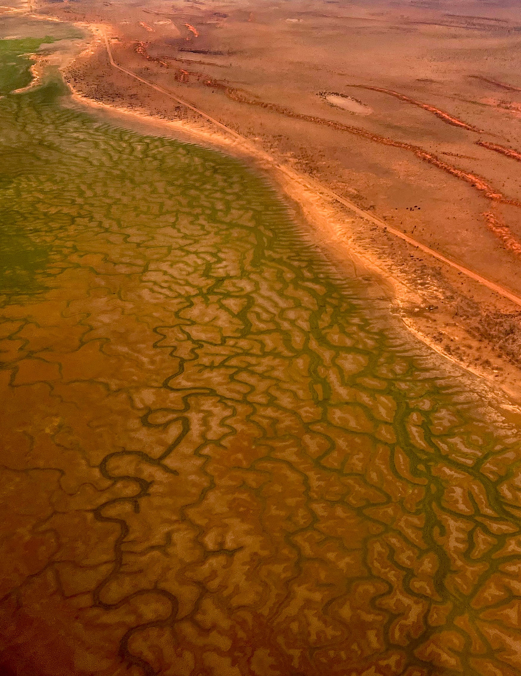 The stark contrast between two distinct landscapes is strikingly evident. On one side of the sand dune, floodwaters sprawl out, shimmering under the sunlight. On the other side of the sand dune, the terrain transforms dramatically into the harsh, unforgiving red gibber rock desert plains characteristic of the Simpson Desert.